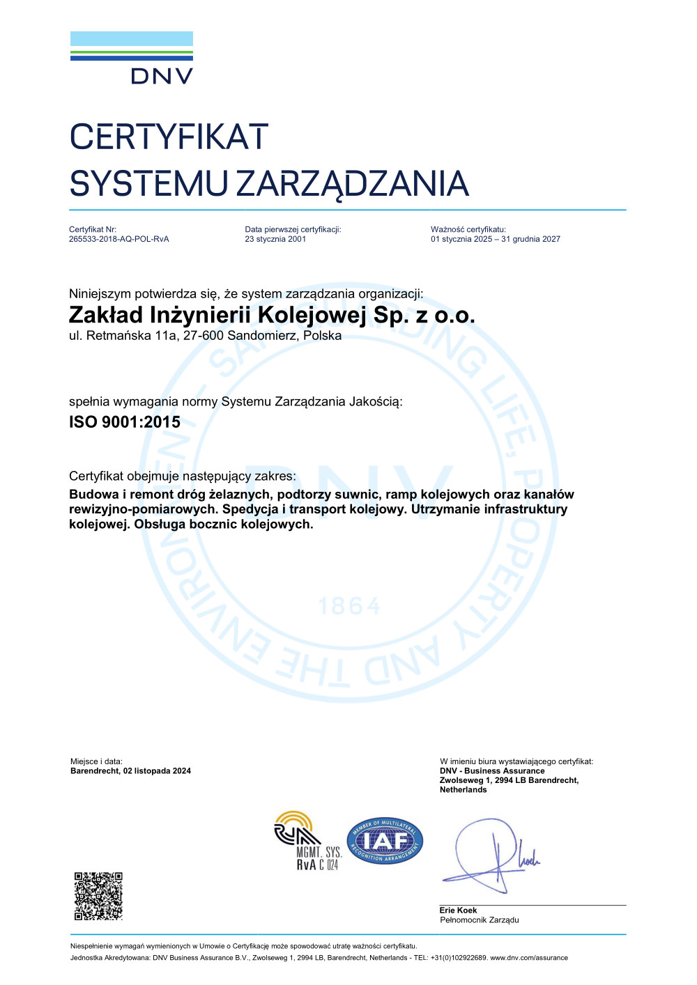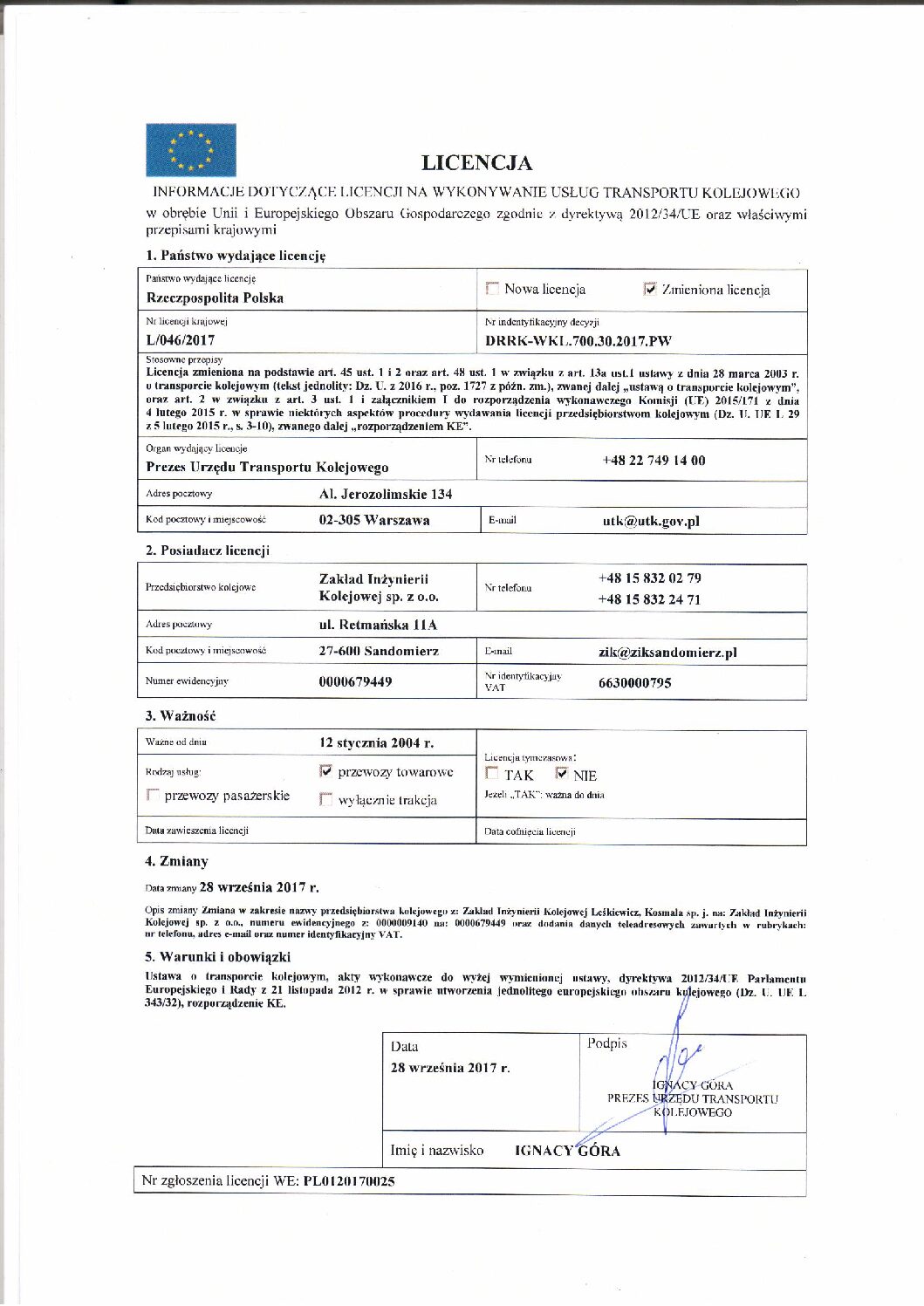 Licencje Pliki do pobrania Licencja na wykonywanie przewozów kolejowych rzeczy Certyfikat ISO 9001:2015